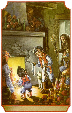 | La Befana 6 Gennaio - Le Parole di Concetta: qui da noi si festeggia la Befana. Quando io ero piccola i regali li portave sempre la befana e non babbo Natale come si usa adesso anche da noi. La befana secondo le nostre tradizioni porta i doni ai bambini è una vecchietta che scendeva dai camini per questo era tutta sporca e nera. Quando noi eravamo piccoli le nostre mamme ci dicevano di fare i bravi e la sera del 5 si puliva il caminetto da tutto il fuoco perchè altrimenti la Befana si scottava. Poi andavamo a dormire e la mattina trovavamo le calze che avevamo messo vicino al camino con tanti piccoli doni, ma c'era sempre anche un poco di carbone e di cenere perchè ci dicevano che non sempre eravamo stati bravi. Io ero sempre più fortunata degli altri perchè essendo figlia unica ricevevo sempre qualche cosa in più e la mattina ero tutta orgogliosa dei miei regali. Poi c'erano i nonni che andavamo a trovare la mattina e anche vicino ai loro camini c'era qualche piccolo regalo. Quando i miei ragazzi erano piccoli i regali li ricevevano sempre alla befana dai nonni e non a Natale. La Befana - Concetta tells me that the 6th of January that La Befana, an old witch came bearing gifts for the children. When she was young, they celebrated La Befana and did not have Santa Claus like they do now. According to their traditions, La Befana came down the chimney with gifts and was all dirty and blackened. the mothers told their children to be good and on the evening of the 5th of January, they cleaned the chimney and put out the fire so that La Befana would not get burned. Then they went to sleep and in the morning they found their socks filed with lots of little presents, but also there would be a little bit of coal and ashes because the children were not always that well behaved. Concetta was always a little more fortunate because she was the only girl and always got a little bit more than her brothers. She was very proud of her gifts. When her children were small they also got their gifts from La Befana at her parents house, and not Christmas. |