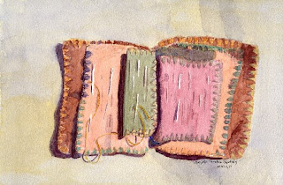 In a previous life, I played stand up bass for an old time string band. As a bass player, you are not really required to think much and as a result you tend to meditate a lot as you play tunes. Tunes with funny names, like Needle case and The girl with the blue dress and Yellow Barber. The list is as long as it is colorful, so as I played the simple rhythms, I would imagine just what these things looked like. Some of course, weren’t so nice, like Yellow Barber refers to a person of mixed racial heritage, but others, like Needle Case, simply referred to things that are no longer common. So I thought it would be fun to paint some of them one day. Just last week, I asked my good buddy Nants for an idea for a postcard painting. She wanted a painting of a guy playing Needle case. So I did that but it just didn’t seem right. So after I got that done, I painted a needle case.