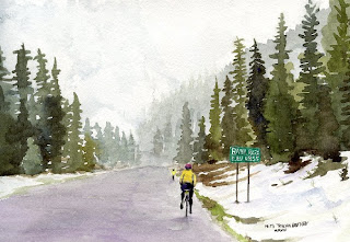 Every summer our local bike show sponsors a rather arduous ride, it’s called Mazama because that’s where it starts. However, the cyclists must climb two mountain passes, where it is often snowing despite the hot summer weather they left behind in Mazama. I was the operator of a support vehicle for the Mazama ride when I met Marilyn. Marilyn is a lovely lady in her 60’s who is one tough bike rider. The wind, the rain, the hills, the snow, none of this slowed Marilyn down. Here’s my painting of her at the summit of Rainy Pass.