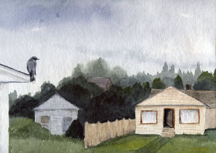 It’s a dreary dank day. A raven sits dolefully on the eaves of the house across the way. The little beige house up the street has been broken into.