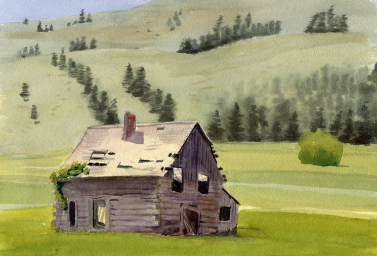 Bicycling is one of our hobbies, we cover a lot of miles on country roads at a leisurely pace. Unlike traveling in a car, we are exposed to the elements, the smells and the sights that you might miss at high speed. On a bike it is easy to stop to pick some flowers, or feed grass to a friendly horse. Near Winthrop, Washington, we found this cabin in a field. It was important to take a photo of it, because we knew that it would eventually collapse. Many of the barns and buildings that my husband has captured with his camera are now gone. The reference for this one was one of his photos.