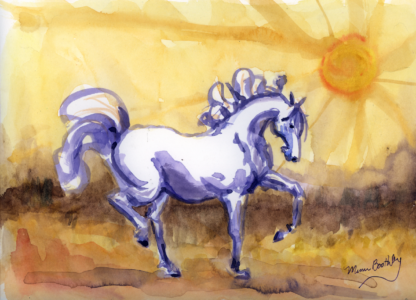 I was given an assignment; to try and reproduce the millions of doodles I did as a young person, of horses. I started out a little intimidated by doodling with a paint brush, but by the 8th one, I was having fun, and this one was #9. This little horse is doing what they call…