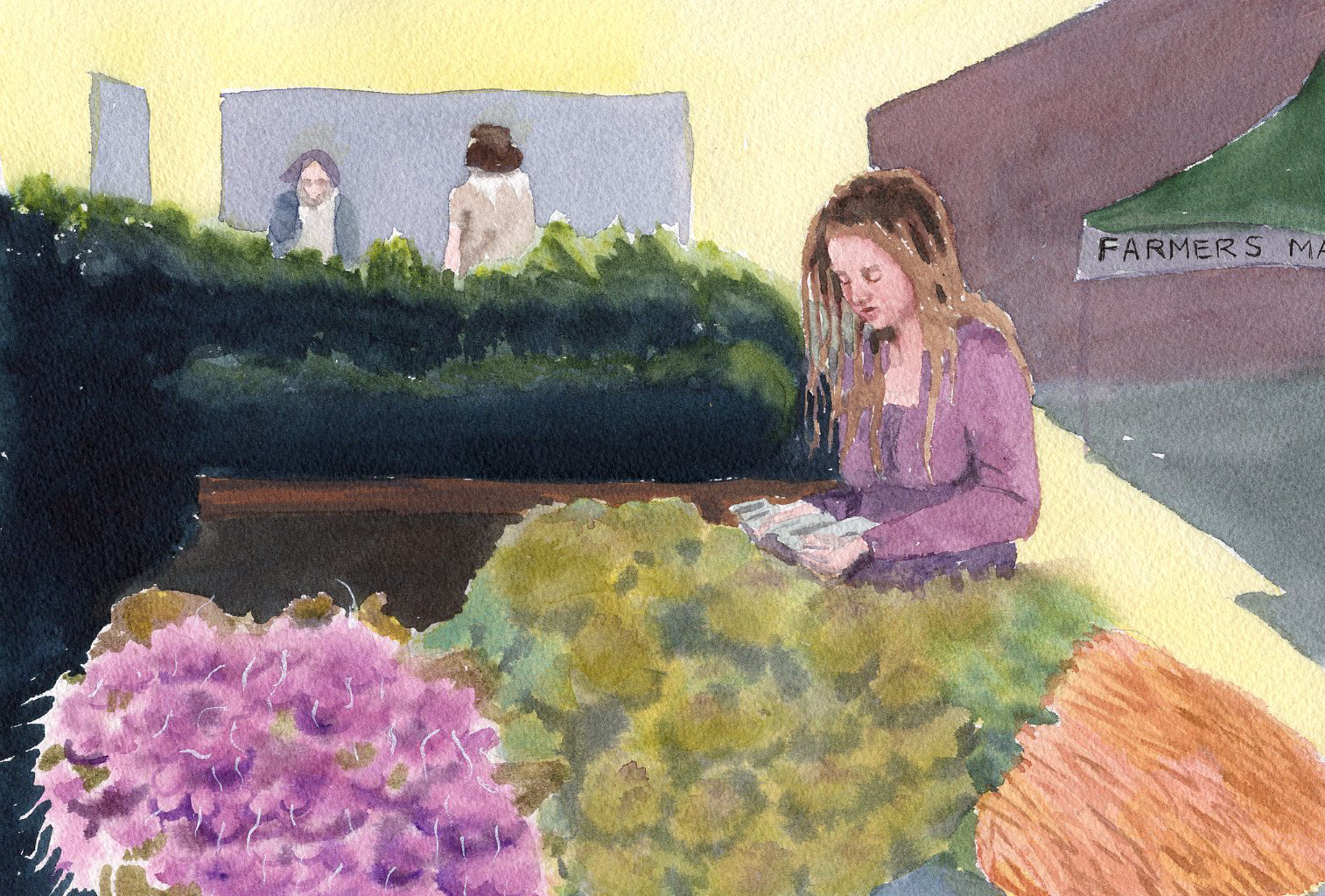 There were a lot of wonderful happenings there that day, and every single person out there was happily taking in the fresh bright sunlight and fresh air. One particular booth, from Full Circle Farms caught my eye. This lovely young vendor was surrounded by her delicate spring vegetables and I had to paint her.