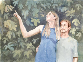 A very important event in a mother’s life is when their son gets married. A very important event in an artist’s life is when a close relative asks for a portrait of themselves and their new wife and the artist is not intimidated by the idea, but instead feels a wonderful challenge. I present to you my latest painting, of Megan and Tom Boothby. It symbolizes many things, the couple’s love for reptilian creatures, the beginning of their discovery of their relationship, and all the biblical connotations as well. This painting also illustrates for me the fact that I can paint, and I can capture likenesses of people as well.