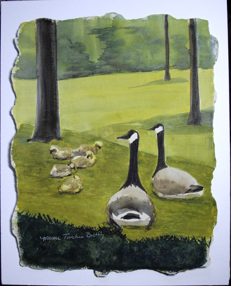 This is a watercolor painted on handmade paper. I bought just one sheet a few years ago, and was afraid to try it at that time because I was afraid I would ruin it. I am happy to say it is not ruined. It is for sale $100.00 buys you a gaggle of geese.