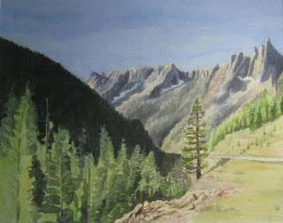 Washington Pass, in the North Cascades Range of Eastern Washington is 5477 feet high. It is dramatic and gorgeous. It was very inspirational, and once again I tried to paint a landscape. Happily, it looks like I succeeded. A certain set of determined cyclists like to ride up that ramp (followed by switch backs) to achieve the ultimate rush, getting to the top of a mile high mountain. You can’t see him in the picture, but my husband was on this road that day reaching for the sky. SOLD